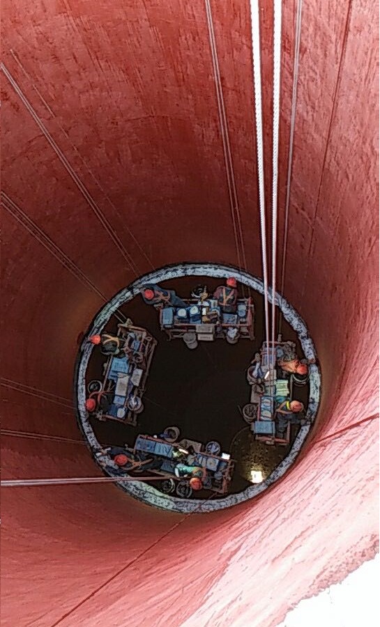 - 根据多年经验和实际情况,采用无脚手架悬吊作业法进行施工。施工方法施工人登高到烟囱顶口平台,将二根20 的尼龙绳带上,固定在烟囱顶部平